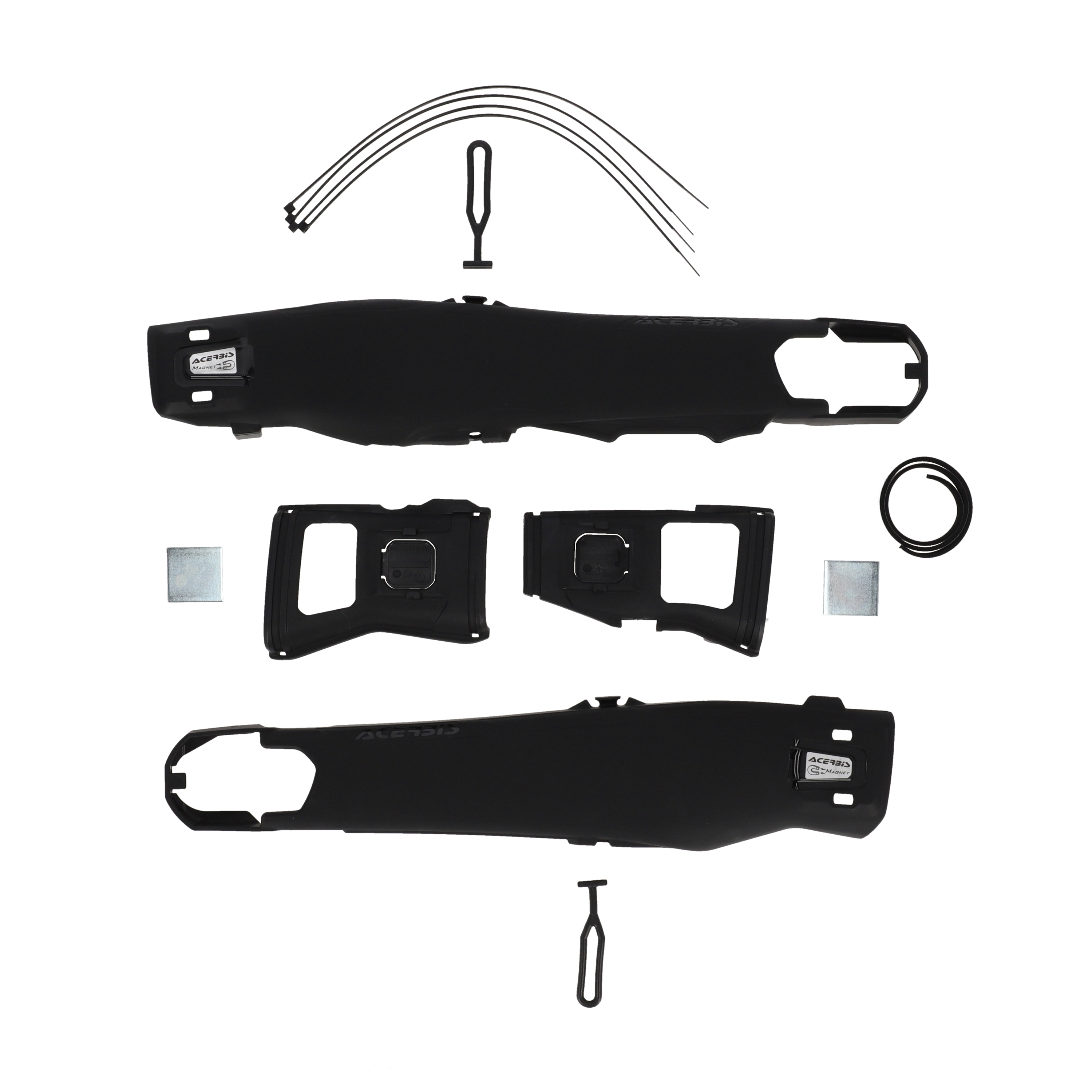 Fixing system that uses magnets and elastic bands, allowing in a few seconds a quick removal of the protections from the swingarm whenever you want to provide washing and/ or maintenance.
